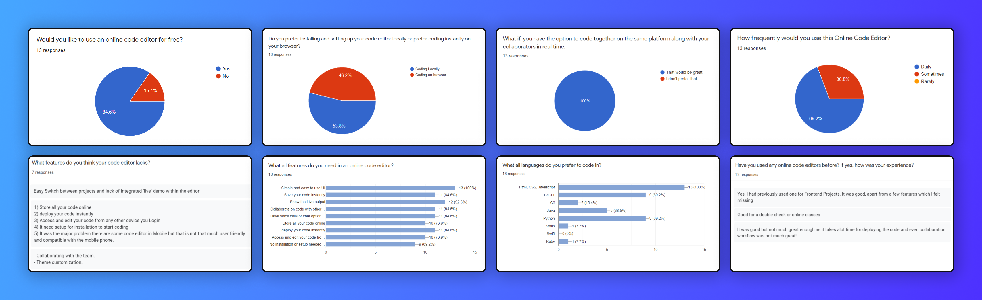 - It showed us what percentage of users would like to use our online code editor. Majority of the people were in favor of using a Real-time Code Editor. Only 15.4% of people were of the other opinion.