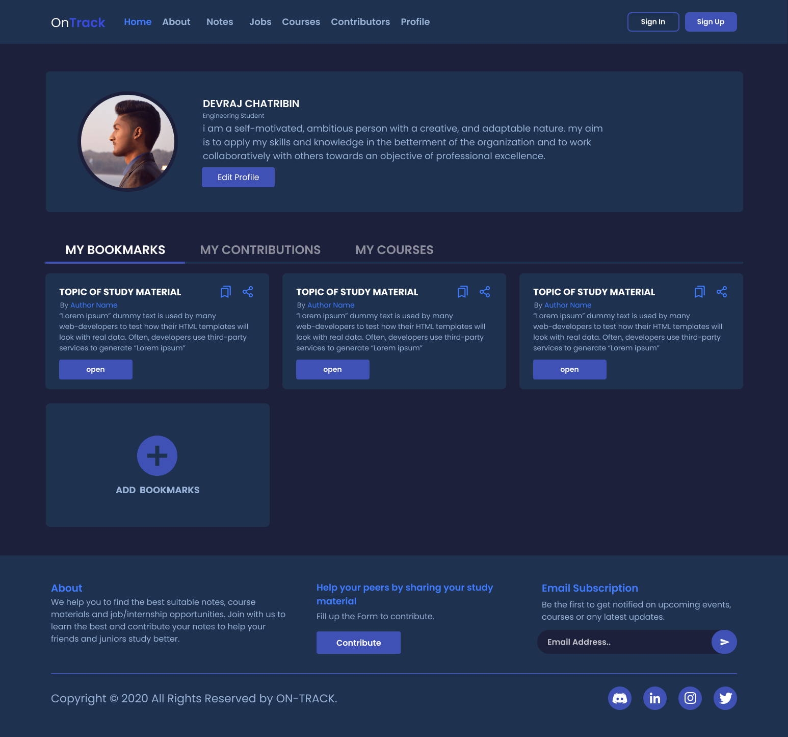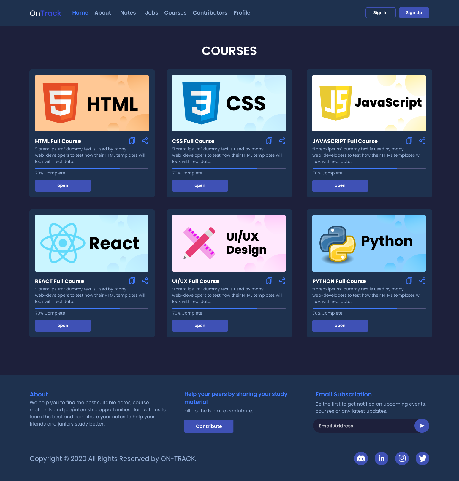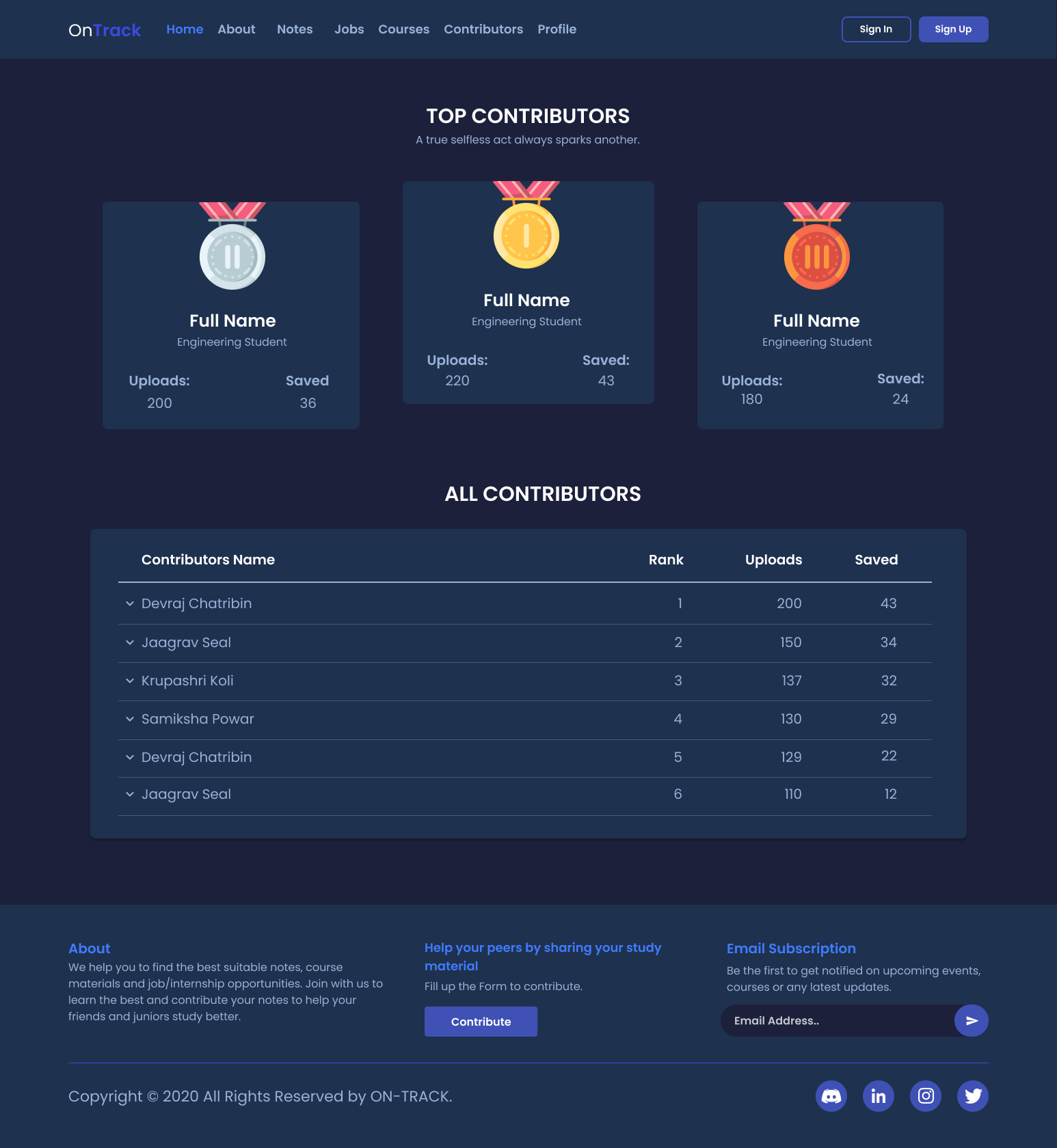 Ontrack is a web app that helps you to find the best suitable notes, course materials and job/internship opportunities. Join with us to learn the best and contribute your notes to help your friends and juniors study better.